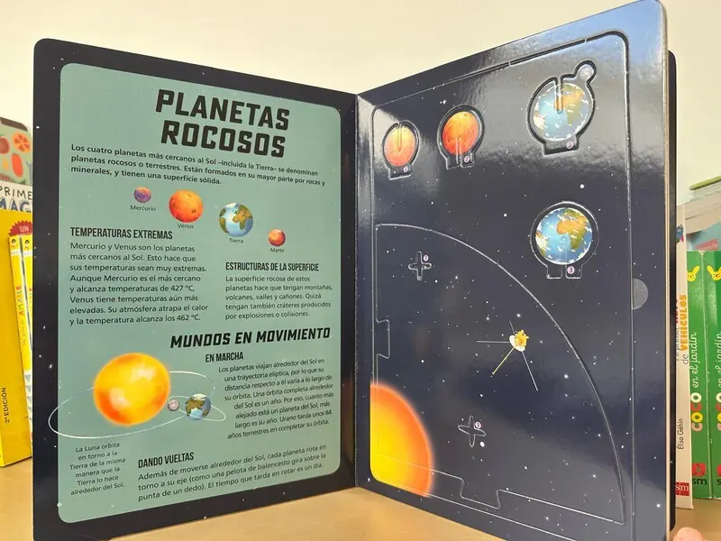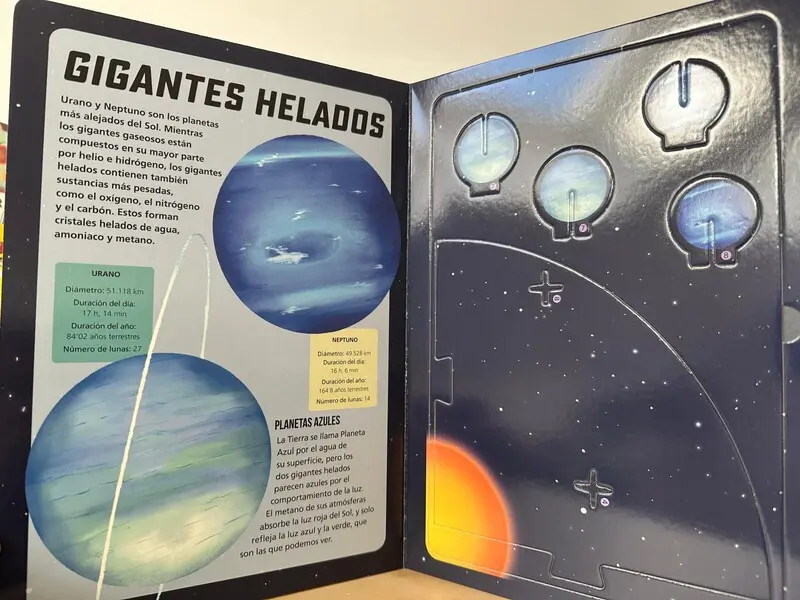 Un libro puzle que contiene todo lo necesario para construir una maqueta tridimensional del sistema solar, extrayendo las piezas de las páginas de cartón del libro y ensamblándolas como un puzle por las ranuras, sin necesidad de pegamento ni tijeras. Al extraer las piezas, además, se descubre en cada página información y datos sorprendentes sobre los planetas que orbitan alrededor del sol.