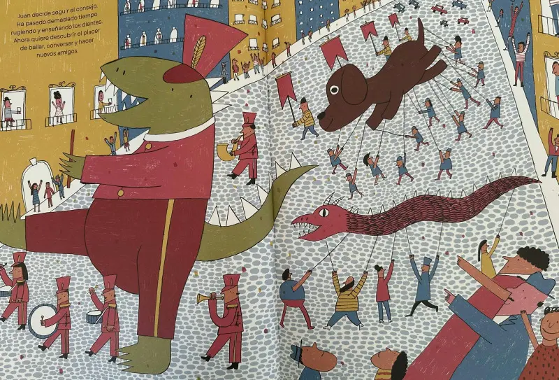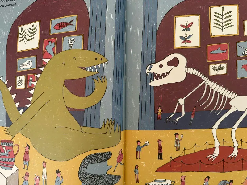 Álbum ilustrado de gran formato sobre expectativas familiares, identidad y humor. Un dinosaurio criado para asustar descubre otra forma de estar en el mundo cuando la ciudad no se inmuta ante su rugido. Lee la reseña completa