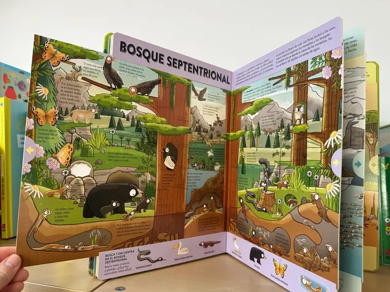 Con este libro ilustrado los niños podrán explorar y aprender el salvaje mundo animal y conocer sus simpáticos habitantes. Desplegando las solapas de cada doble página se pueden explorar hábitats de todo el mundo, desde la selva amazónica hasta la tundra del helado Ártico. Además podrán aprender datos sobre diferentes criaturas, desde las diminutas termitas hasta las gigantes yubartas. Este libro con sus detalladas ilustraciones fomenta la observación y la agudeza visual, ya que en cada página se propone a los niños que busquen animales ocultos en el cielo, en la tierra y bajo el agua.