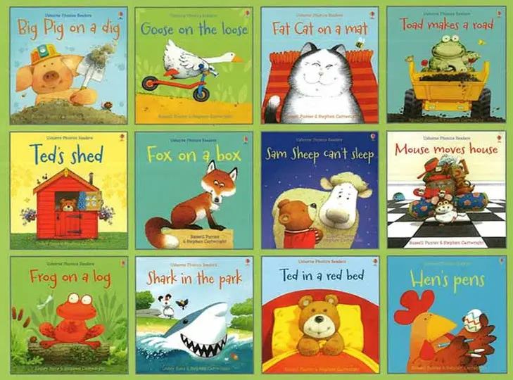 Beautifully illustrated stories which engage children and start their love of reading. These amazingly constructed stories use phonics-based reading as a tool to help with your children reading at an early age. Features: Recommended Ages: 5-7 Format: paperback Author: Usborne Publishing Language: English Titles: Ted's shed Toad makes a road Shark in the park Big pig on a dig Goose on the loose Mouse moves house Sam sheep can't sleep Fat cat on a mat Fox on a box Hen's Pens Ted in a red bed Frog on a log