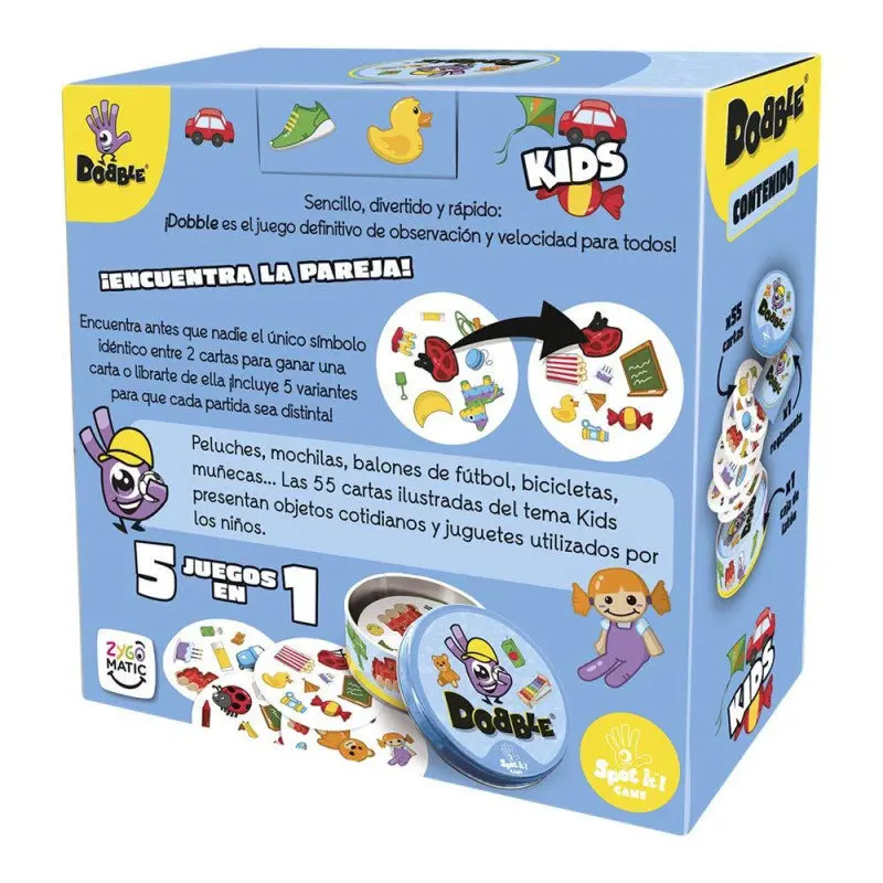DOBBLE KIDS CONTIENE 30 CARTAS, 30 ANIMALES Y UN ANIMAL IDENTICO ENTRE CADA DOS CARTA DEL JUEGO. PARA GANAR, ENCUENTRALO ANTES QUE TUS AMIGOS. COMO SU HERMANO MAYOR, DOBBLE KIDS CONTIENE 5 MINI JUEGOS QUE UTILIZAN ESE PRINCIPIO. TRES ESTAN INSPIRADOS EN LOS DE DOBBLE, Y OTROS DOS ESTAN ESPECIFICAMENTE DISEÑADOS PARA ESTA VERSION INFANTIL. CON EL FIN DE SIMPLIFICAR EL JUEGO Y SU DURACION HAY MENOS SIMBOLOS EN CADA CARTA QUE EN EL DOBBLE ORIGINAL... íIDEAL PARA PARTIDAS ENTRE EDADES MUY DIFERENTES